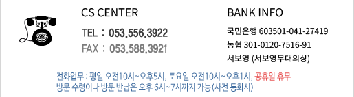 ÁÖ¼Ò : ´ë±¸½Ã µ¿±¸ µ¿ºÎ·Î 76 (½ÅÇù ÁöÇÏÃþ) / TEL : 053-556-3922, FAX : 053-588-3921
